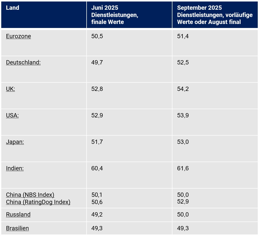 Der Dienstleistungssektor bewegte sich im 3. Quartal 2025 laut Einkaufsmanagerindices in einer Gesamtbetrachtung im erhöhten Wachstumsmodus und sorgte für die gute Performance der Einkaufsmanagerindices bezüglich der Gesamtwirtschaft (Composite Indices).